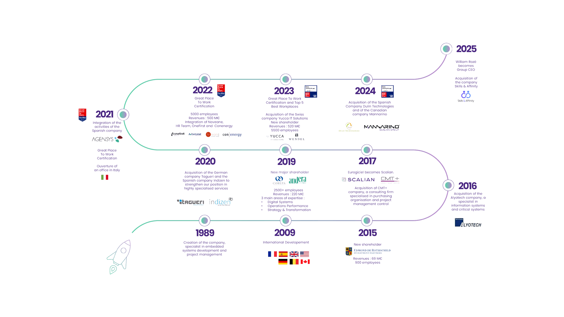 Ranking among France’s top 10 engineering consultancies, Scalian Group serves French and international markets. Its services include industrial project management, supply chains (cost, quality, deadline, performance), the architecture and development of embedded digital systems and information system applications, big data and AI. It also deals with issues relating to project optimisation and organisational performance, as well as digital transformation challenges for leaders in the industrial and service sectors. In 2025, the Group employs 5,800 people in 12 countries, with a revenue of €530 million.